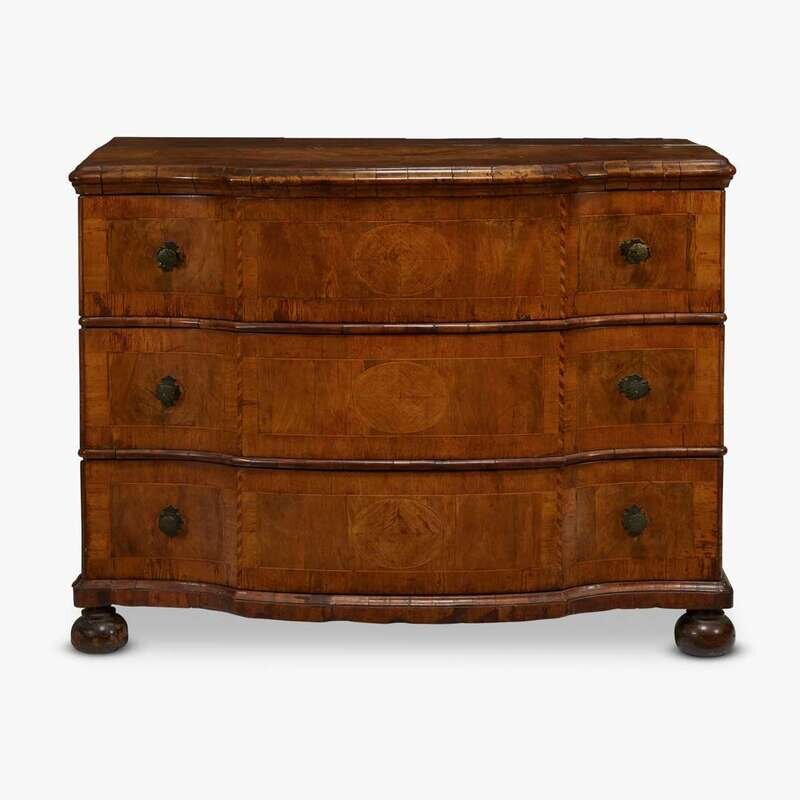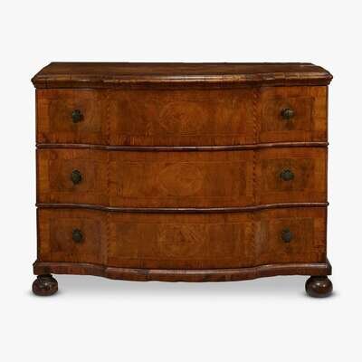 German walnut and marquetry three-drawer bowfront commode second quarter 18th century