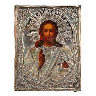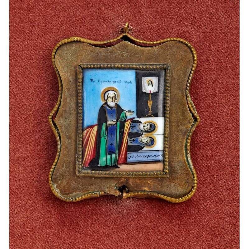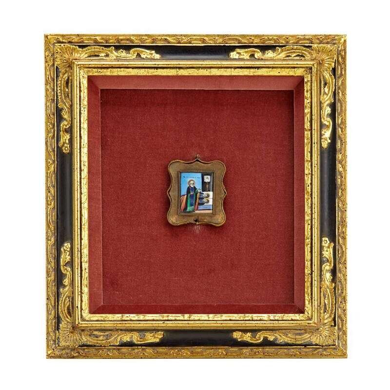 Comprising an icon of Christ Pantocrator and one of the the Tikhvin Mother of God; together with a small Russian enameled copper pendant in shadow box. (3).