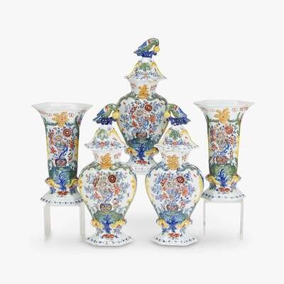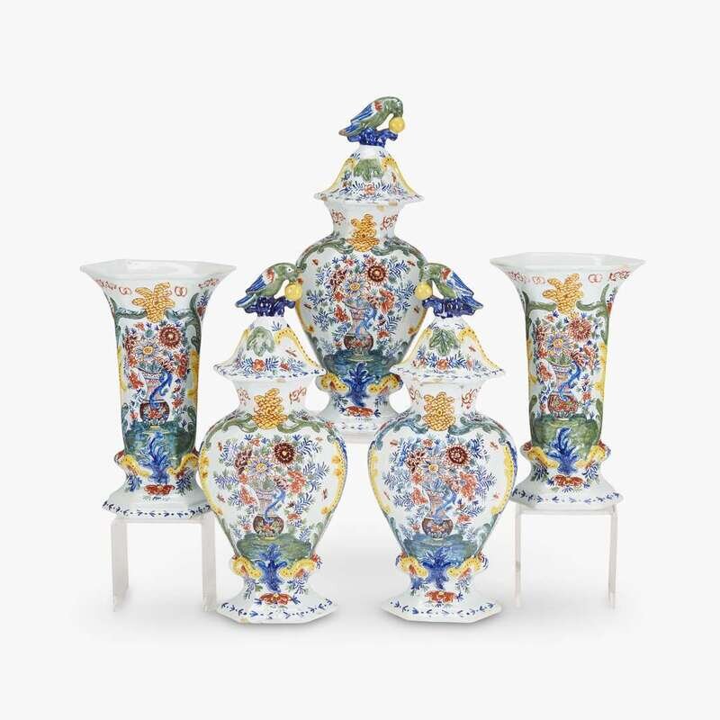 Fine Dutch Delft five piece polychrome decorated vase garniture "De Paauw" (The Peacock), first quarter 18th century