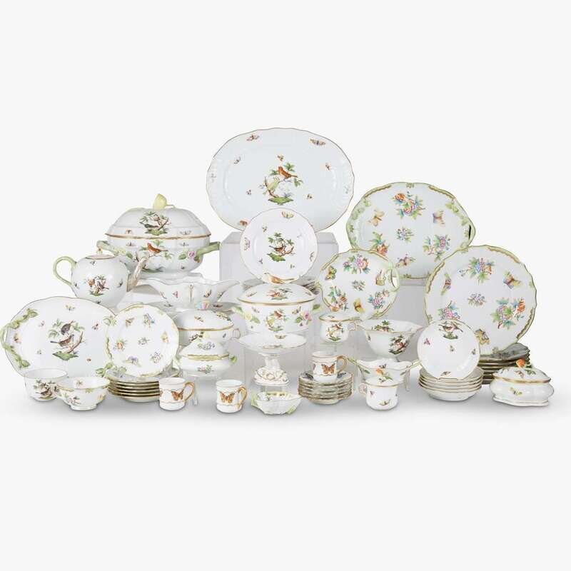 Comprising fourteen each bread plates, salad plates and dinner plates, eleven teacups and twelve saucers, 15 pots de crème, one tea pot, a large covered tureen and stand, two gravy boats on stands of slightly differing forms, a tray, small covered vegetable dish, two small covered tureens, a small basket, a footed bowl and tazza, all in the Rothschild Bird pattern; eleven dinner plates, nineteen saucers, eight teacups, a tray, leaf form dish, miniature leaf tray, and small covered tureen, all in the Queen Victoria Pattern; together with a set of six demitasse cups and saucers. (approx. 146 pieces).