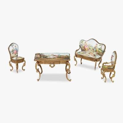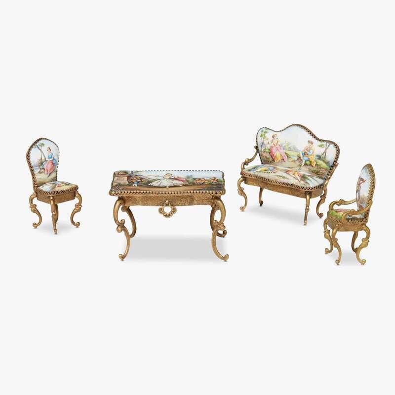 Comprising a side chair, a fauteuil, a settee, and a center table with opening drawer; each depicting 18th century fêtes galantes and stamped "Austria" to underside. (4).
