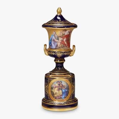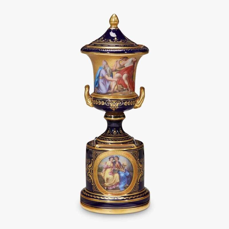 Of campana form, finely gilt decorated on cobalt ground and hand-painted with mythological subjects, signed "F. Kohl"; with conforming lid and raised on integral cylindrical base; stamped and numbered to underside.