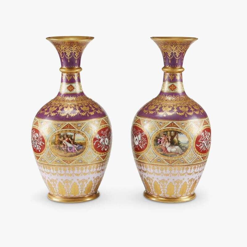 Pair of Vienna style jeweled and parcel-gilt porcelain vases 19th century