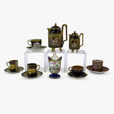 Comprising a three-piece cobalt Rudolstadt coffee service with pot, creamer, and sugar, each with scenes of "Amour & Psyche", titled and marked to underside; two Vienna style demitasse cups and saucers with scenes of "Schmückung" and "Geruch", titled and marked to underside; one maroon Vienna style demitasse cup and saucer with a scene of Cupid and Psyche, marked to underside; one Minton white and cobalt floral decorated demitasse cup and saucer, marked to underside; one cobalt Coalport demitasse cup and saucer, marked to underside; and one blue Sèvres style creamer with reserve of birds, bearing a Sèvres style mark to underside. (9).