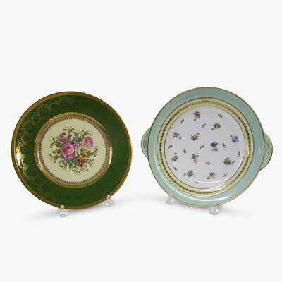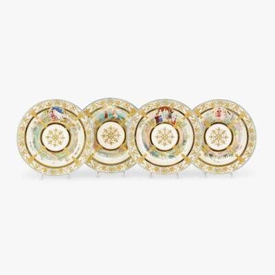 Comprising four dishes each finely painted with a vignette depicting figures from a Wagner opera against a continuous landscape encircling the central gilt decorated reserve, each signed Friedrich and very finely gilt with four flower filled urns and a border of arabesques with cartouches depicting musical trophies, including "Meistersinger", "Parsifal""Tannhauser u. Venus", and "Rheingold", each titled in script to the base and with gilt factory mark; together with two Limoges dishes. (6).