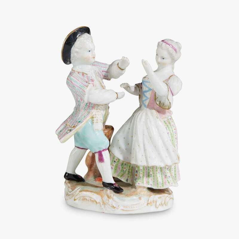Depicting a dancing couple in provincial 18th century dress, raised on naturalistically modeled base; marked to underside with blue crossed swords and incised with initials "L. t." and number "1514".