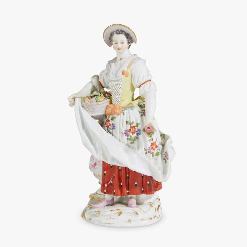 Modeled as a flower seller holding a basked of various blooms and offering a rose, standing next to a vase of verdant pink roses; marked to underside with blue crossed swords, incised "C. 68." and impressed "73 42".