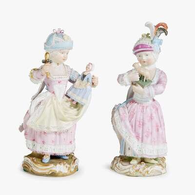 Each depicted with toys, the first holding a toy lamb and the second holding a doll and a rattle; each marked to underside with blue crossed swords and stamped "127", and inscribed with model numbers "C. 90" and "C. 79", respectively. (2).