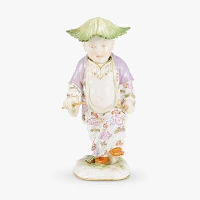 Modeled in the form of a marching boy wearing a green leaf hat and indianische blumen robes and holding batons in each hand, the base incised "7258", stamped 59, and with blue crossed swords mark to base.