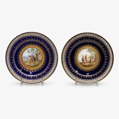 Each finely gilt decorated on cobalt ground and painted to the well with scenes of idyllic peasant life, marked to reverse with blue underglaze crossed swords and impressed "8 22 138" and "8 601 68", respectively. (2).