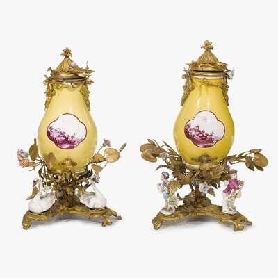 The yellow-glazed vases decorated with quatrefoils centering coastal scenes painted en grisaille, the rims mounted with hinged gilt-metal lids cast with water foliage and porcelain flowers, the necks applied with masques, the base drilled for a spout fitting, each above a tripartite base en rocailles, one mounted with three swans, the other with three figures, the bases with issuing lilypads and cattails mounted with porcelain flowers. (2).