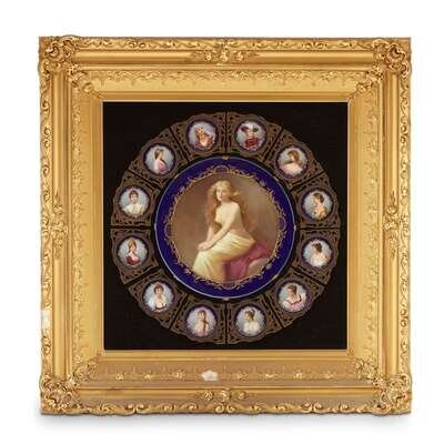 Comprising a central circular plaque painted to show a semi-nude maiden allegorical of 'solitude' encircled by twelve smaller plaques painted with portrait profiles, each set within reticulated metal borders, mounted and framed.