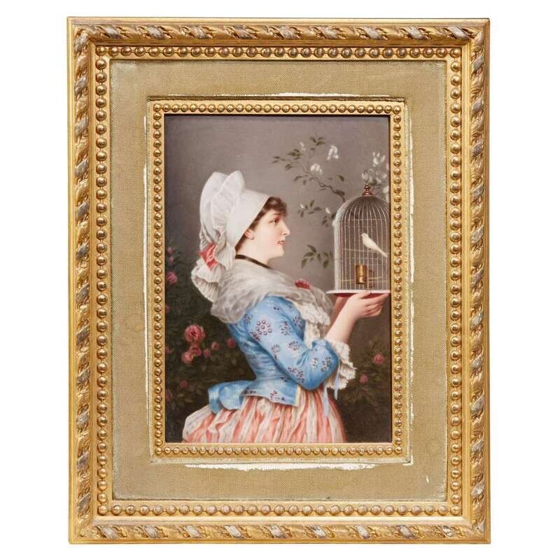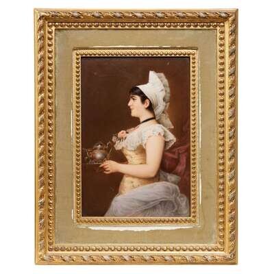 Each finely painted with a half-length figure of a woman in profile, one in Spanish dress shown carrying a tray with tea, the other in Victorian dress carrying a bird cage, with impressed K.P.M. scepter mark to reverse; each framed. (2).