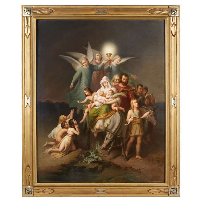 Finely painted after Wilhelm von Kaulbach (German, 1805-1874) with a Biblical scene depicting the Holy Family guided by a host of angels; incised and impressed with "KMP" and scepter mark to verso.