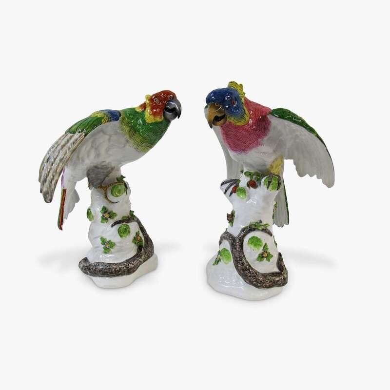 Pair of painted porcelain parrots in the manner of Kalk, 20th century