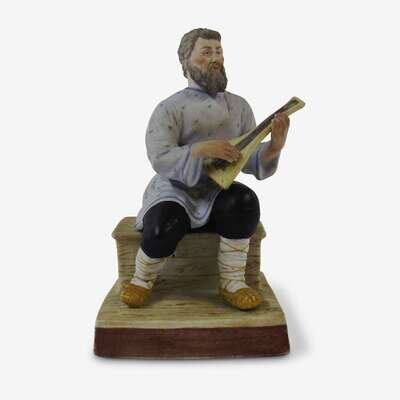 Depicting a seated man in folk dress playing the balalaika, the underside with impressed factory mark and model number 16, as well as overglaze red stamp reading "Fabrik Gardner' v' Moskve" in cyrillic surmounted by the imperial double-headed eagle.