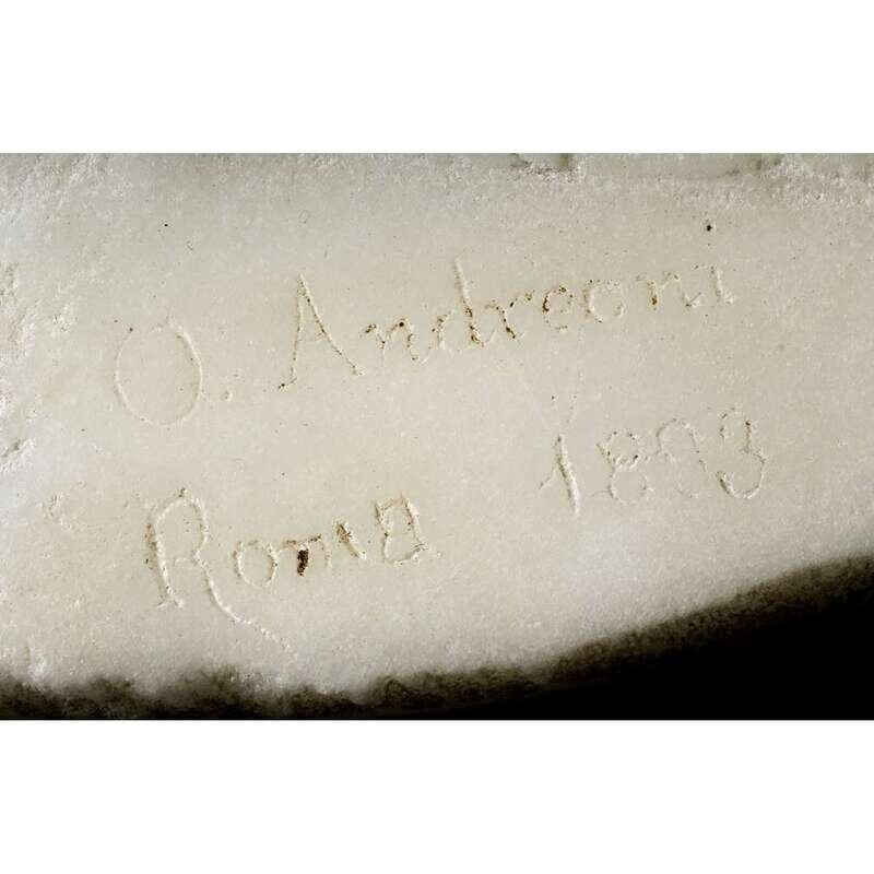 White marble, depicting a standing figure of cupid sheathed in transparent drapery, the base signed "O. Andreoni/Roma 1893".