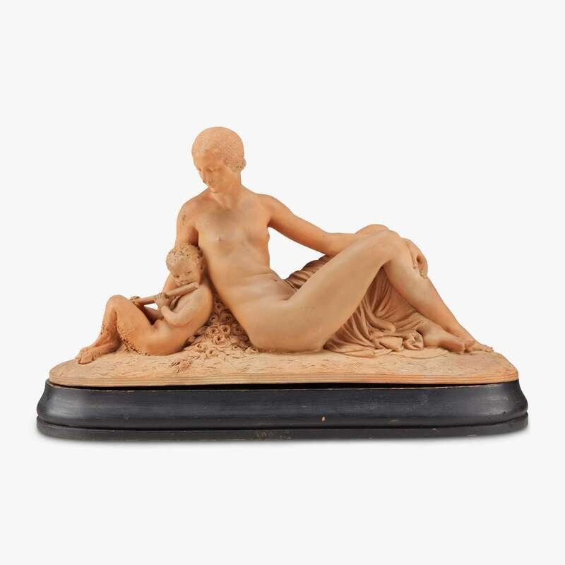 Terracotta, modeled in the form of a nude nymph seated beside a satyr, signed "J. Cormier" and marked "Barbedienne Edt. Paris", raised on custom wood stand.