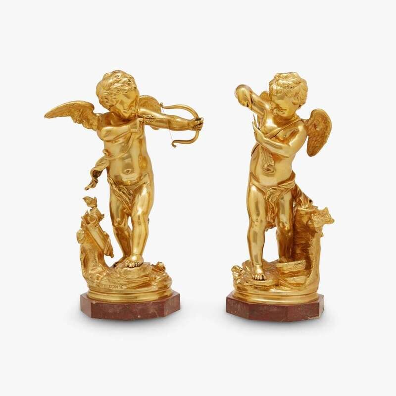 Comprising two gilt bronze models of cupid, one depicted aiming his bow, the other admiring his arrow, each signed in cast "L. Gregoire" and raised on rosso marble base. (2).