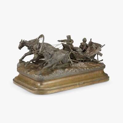 Bronze, mid-brown patina, depicting a troika with driver and three horses carrying two officers and a dog as passengers, raised on rectangular base; signed in cast in Cyrillic, with Sokolov foundry marks.