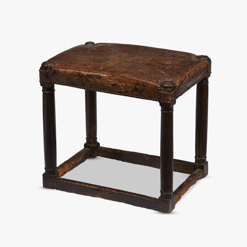 With later tooled leather-covered seat worked with Baroque style foliate motifs, raised on four turned legs joined by stretchers.
