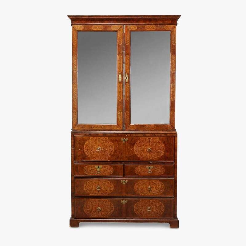 The molded cornice above a pair of mirrored cupboard doors enclosing shelves, the lower section with a ssecretary panel hiding a series of pigeonholes and drawers centered by a locked compartment, above two short and three long drawers, raised on bracket feet; the whole decorated with reserves of very fine seaweed marquetry.