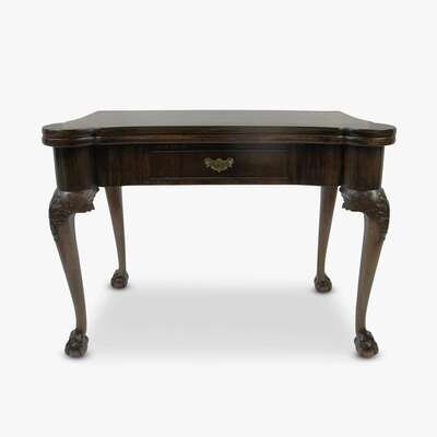 The hinged top above a single frieze drawer, raised on cabriole legs with foliate carved knees terminating in ball-and-claw feet.