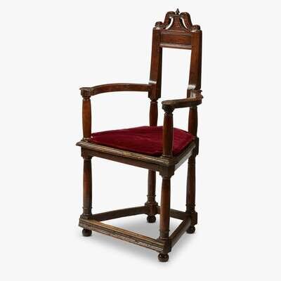 With scrolled crest and open back above U-shaped arms and splayed seat with later velvet upholstered cushion, raised on turned and joined legs and bun feet.