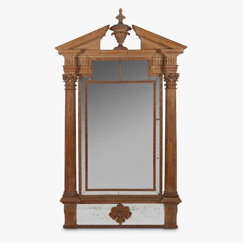 With divided triangular pediment centered by an acanthus-wrapped urn above a fluted inverted breakfront frieze; the banded plates flanked by fluted tapering columns surmounted by Corinthian capitals, supported by imbricated corbels flanking a lower plate centered by a mounted foliate appliqué; bearing partial label stating "Kearney/Carver, Gilder & Looking Glass Maker. to His Majesty, & His Exc..." to verso.