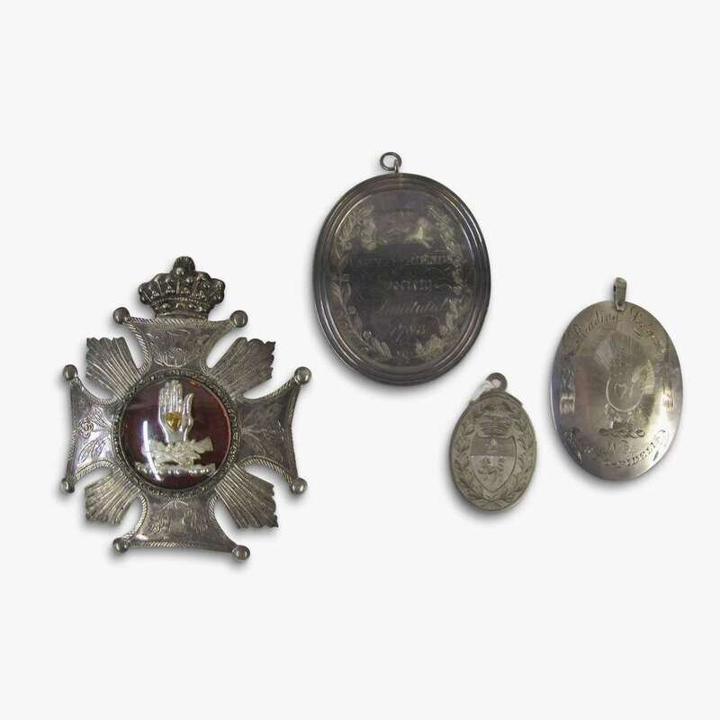 Makers include Alice & George Burrows II and Michael Starkey, each engraved with a hand or a hand shake and inscription; one surmounted by a crown and suspended from red ribbon. (4).