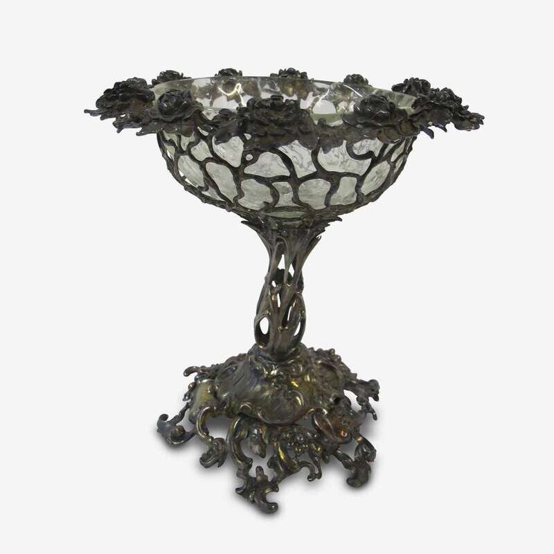 Reticulated basket with repoussé and chased florals and foliage to rim, above a naturalistic openworked stem and base, with removable glass bowl.