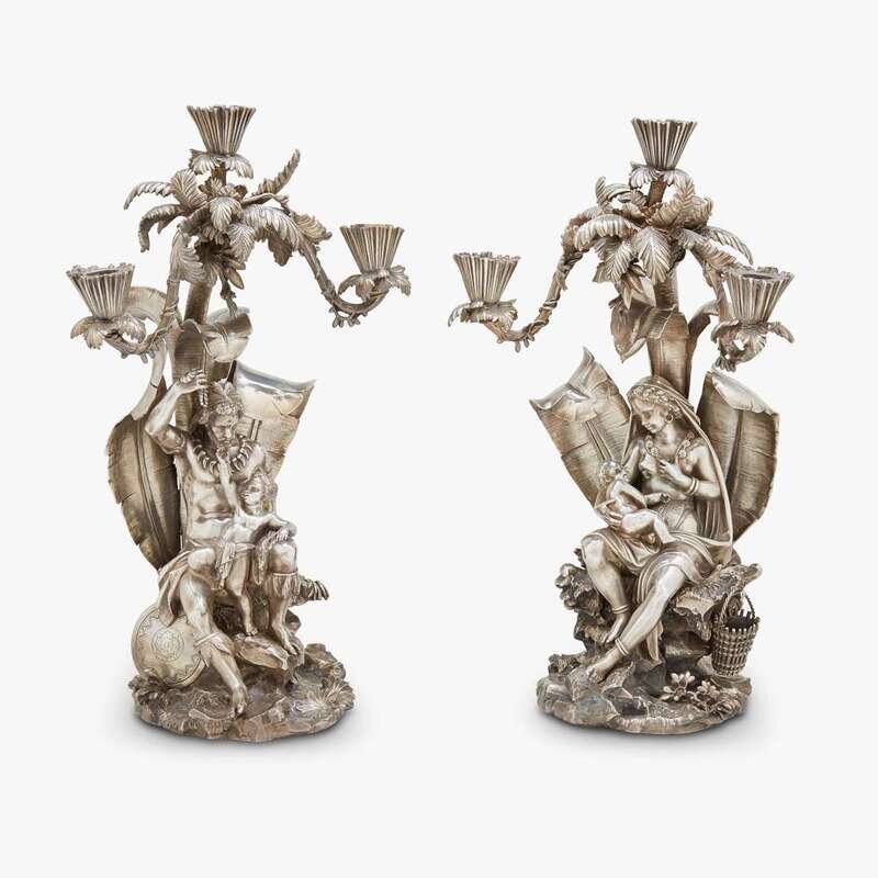 Each designed as a "Nubian" male and female dressed in exotic garments holding a child, seated under a palm tree issuing three foliate candle arms, the base stamped "Elkington Mason & Co." with a further inscription. (2).