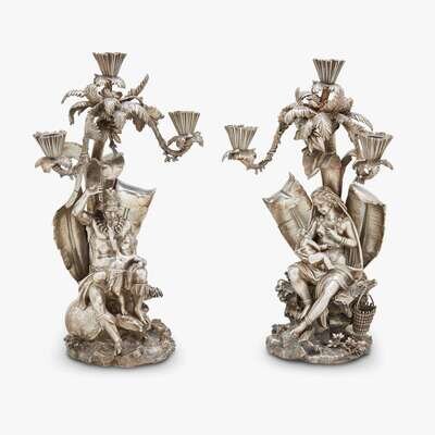 Pair of Victorian silvered bronze three-light figural candelabra Elkington, Mason & Co., Birmingham, circa 1860