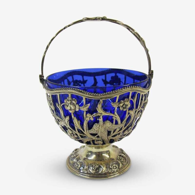 Edward VII silver candy basket with cobalt glass liner George Fox, London, 1901-02