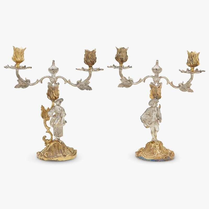 Each centered by a figure in 18th century dress, standing atop a silver-gilt rocaille base, issuing twin candlearms and foliate sockets. (2).