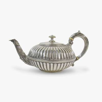 Squat circular form with fluted body and midband, the cover engraved with armorial and monogrammed.