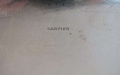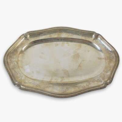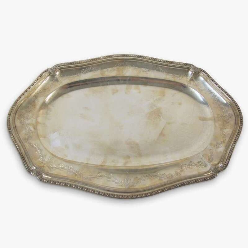 Shaped oval with beaded rim, the border engraved with garlands, .950 standard.