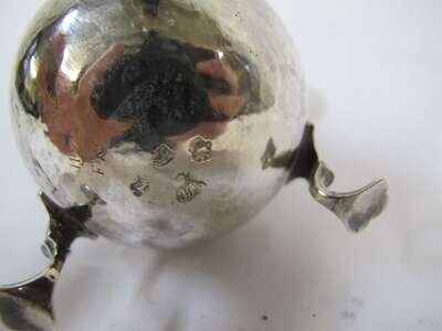 Baluster form raised on three feet with double scroll handle and scalloped rim, engraved initials to underside.