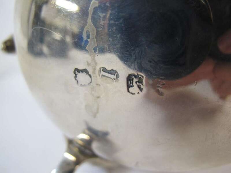 Typical form with double C-scroll leaf-capped handle, raised on three paw feet.