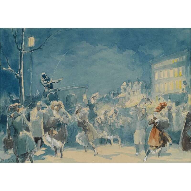 EVERETT SHINN (AMERICAN 1876-1953) "THE PLAZA LOOKING NORTHEAST AT 59TH STREET"