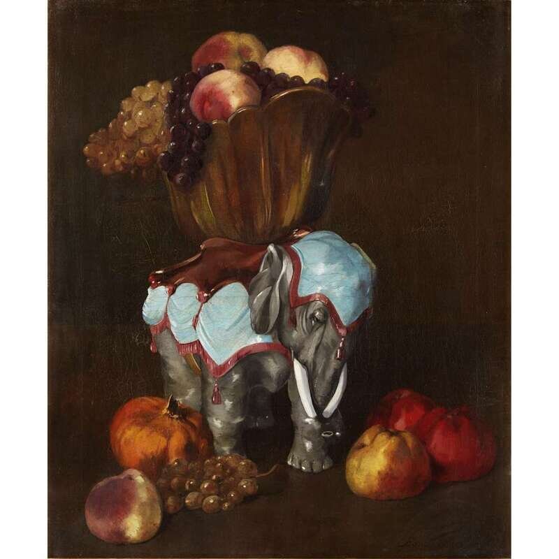 EDMOND VAN DER MEULEN (BELGIAN 1841-1905) STILL LIFE WITH ELEPHANT STATUETTE AND MIXED FRUITS