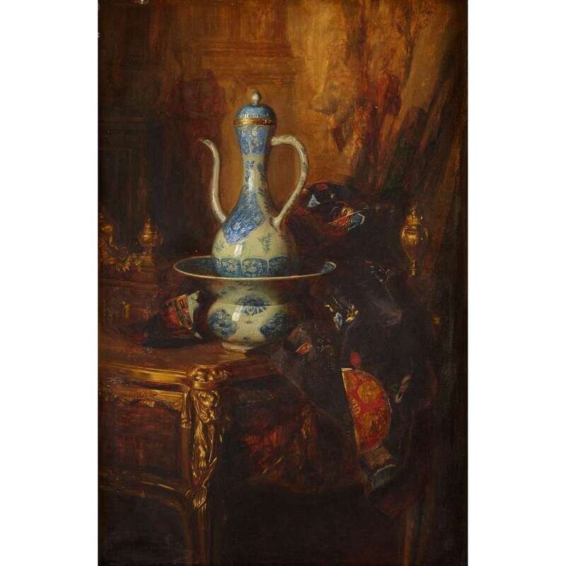 BLAISE ALEXANDRE DESGOFFE (FRENCH 1830-1901) STILL LIFE WITH EWER AND ACCOUTREMENTS ON GILT MOUNTED BUREAU PLAT