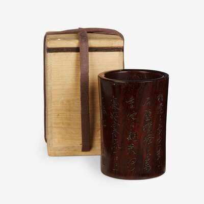 A Chinese huanghuali inscribed brush pot wu yun signed, qing dynasty