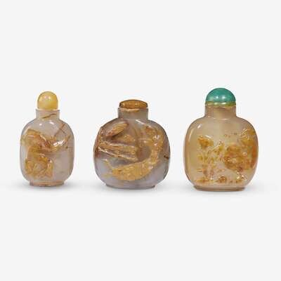 Three Chinese carved agate snuff bottles 19th century