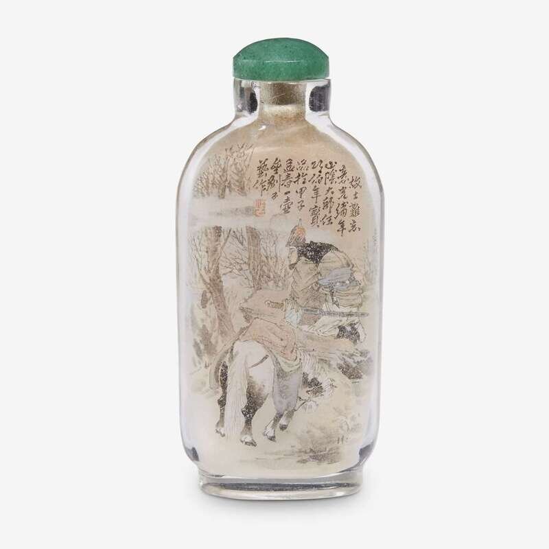 of flattened rectangular form intricately painted with an armoured figure on horse, verso with zhongkui and demon.