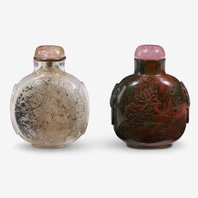 comprising a rock crystal unadorned snuff bottle, with black mineral inclusion; and a hardstone snuff bottle incised with lotus and mandarin duck, verso incised with two chicken and flower. (2).