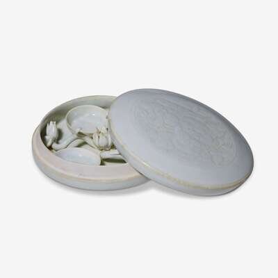 A rare Chinese carved qingbai 'boys' cosmetic box and cover song dynasty