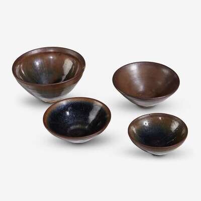 the conical sides rising from a short straight foot to a lipped rim, all covered in a black glaze suffused with reddish-brown streaks (4).