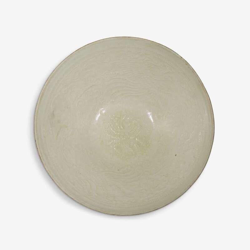 the deep widely flaring sides rising from a short foot, moulded to the interior with a medallion enclosing phoenix in flight, covered overall with an ivory colored glaze.