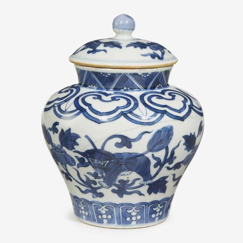 A Chinese blue and white 'fu lion' jar and cover 17th century